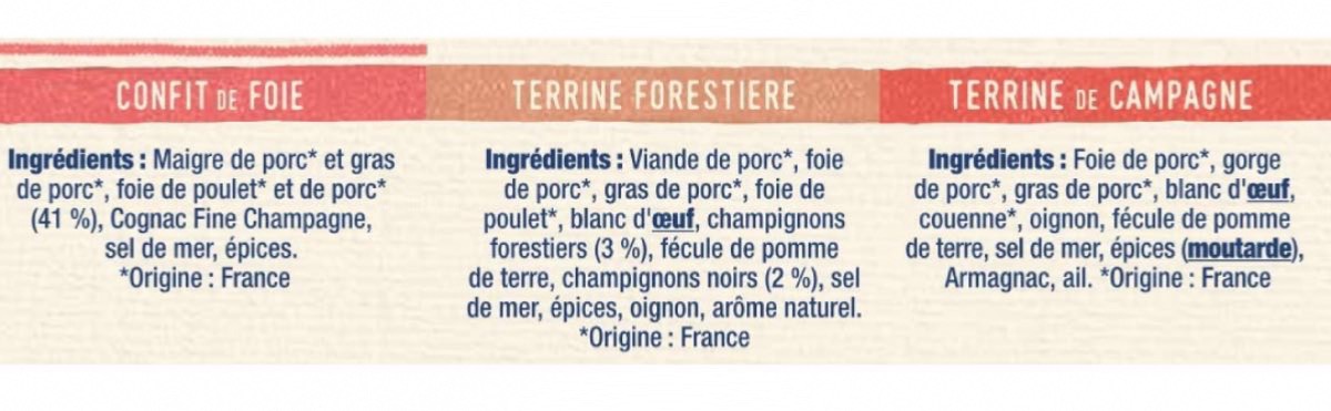 Ingrédients : TERRINE DE CAMPAGNE TRADITIONNELLE Foie de porc, gorge de porc, gras de porc, blanc d'oeuf, couenne, oignons, fécule de pomme de terre, épices (Moutarde), sel de mer (1.2%), Armagnac, ail. Sans conservateur. TERRINE FORESTIERE Viande de porc, gorge de porc, gras de porc, blanc d'oeuf, couenne, oignons, fécule de pomme de terre, épices (Moutarde), sel de mer (1.2%), Armagnac, ail. Sans conservateur. CONFIT DE FOIE A LA FINE CHAMPAGNE Maigre de porc et gras de porc, foie de poulet et de porc, Champignons forestiers,Champignons noirs, fécule de pomme de terre, arôme naturel, épices, conservateur : nitrite de sodium.