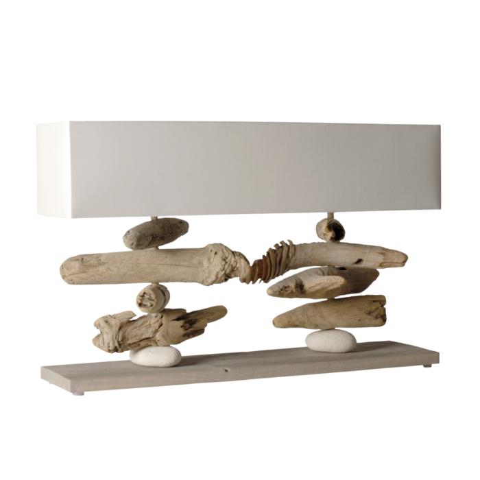 - La lampe est composée de deux tiges, décorées de bois vieilli, de bois flotté et de galets empilés. L'abat-jour est blanc. Elle peut servir de lampe à poser décorative ou de lampe de chevet.