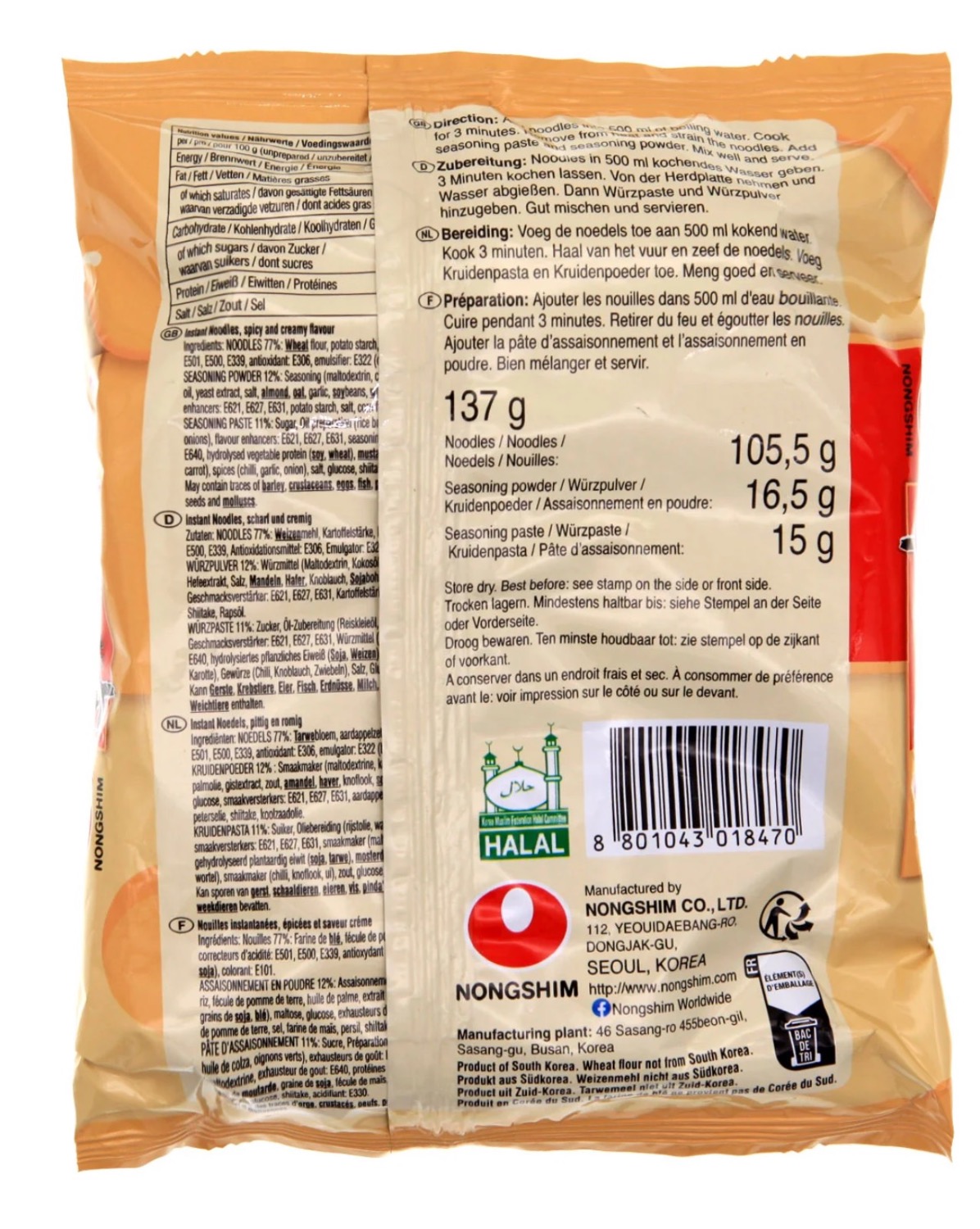 Nouilles Nongshim Toomba Saveur Epicée et Crémeuse 137g/Sachet